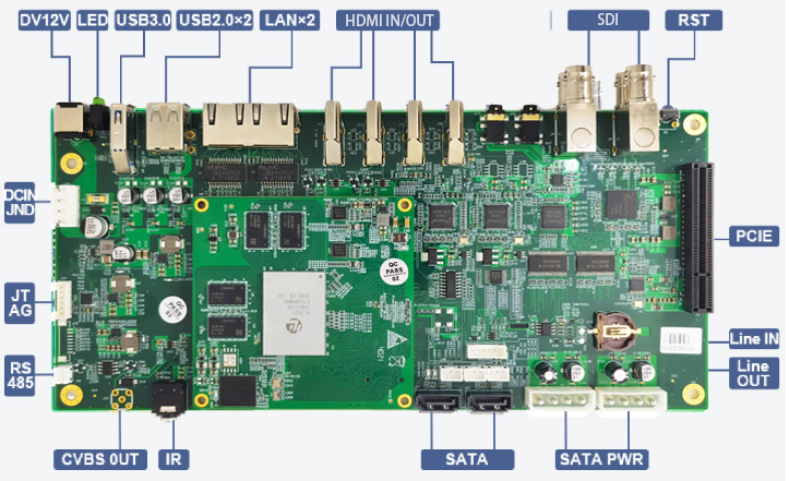 HI3531DV200處理器核心具有四核ARM Cortex-A53@ 1.15GHz,32KB I-Cache,32KB D-Cache,512KB L2 Cache,支持NEON 加速,集成FPU 處理單元。HI3531DV200主板提供4路HDMI輸入、2路HDMI輸出、2路USB2.0、1路USB3.0、1路10M/100M網絡、RS232、RS485、GPIO、RTC等豐富外圍接口。